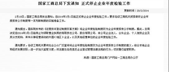 国家工商总局下达通知今年3月1日起停止营业执照的年检工作